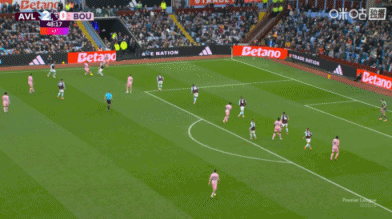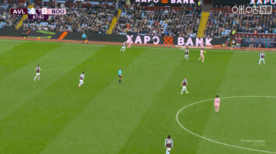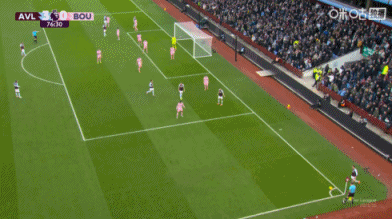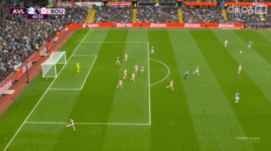 Phút 40, Rogers chuyền qua cánh trái rồi chuyền ngược lên đầu vòng cung. Onana sút xa đi trúng chính giữa khung thành. Aston Villa 2-0 Bournemouth. ↓