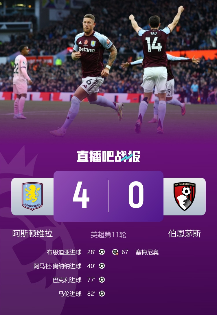 Tin tức ngày 9/11 Vào 22h ngày 9/11, ở vòng 11 Ngoại hạng Anh, Aston Villa đối đầu Bournemouth trên sân nhà Villa Park. Trong hiệp một, Buendia ghi bàn bằng quả đá phạt trực tiếp và Onana ghi bàn làm dậy sóng thế giới. Trong hiệp hai, Evan Nelson đánh đầu ở giữa, Rogers thực hiện quả phạt đền, Martinez cản phá quả phạt đền của Semenho, còn Barkley và Mullen đóng góp vào sân thay người. Chung cuộc Aston Villa đánh bại Bournemouth 4-0.