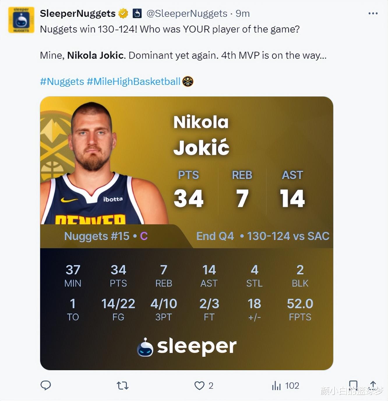 Vào ngày 4 tháng 11, Nuggets đã đánh bại Kings với tỷ số 130-124 để tránh chuỗi trận thua. Ở trận đấu này, Nikola Jokic không hề thể hiện sự cẩu thả trong cả tấn công lẫn phòng thủ. Anh ta đánh bại hoàn toàn Sasha, và đội hình nhỏ của Kings bị Jokic đánh bại. Jokic ghi được 34 điểm, 14 kiến tạo và 7 rebound khi thực hiện 14/22 cú sút. Giá trị hiệu quả quá cao.